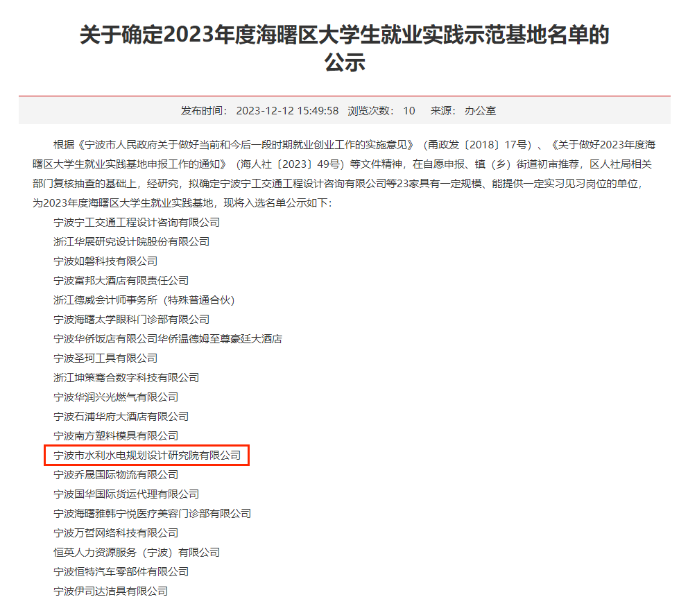 發布日期:2023.12.21 近日,根據《寧波市人民政府關于做好當前和今后一段時期就業創業工作的實施意見》(甬政發〔2018〕17號)、《關于做好2023年度海曙區大學生就業實踐基地申報工作的通知》(海人社〔2023〕... -