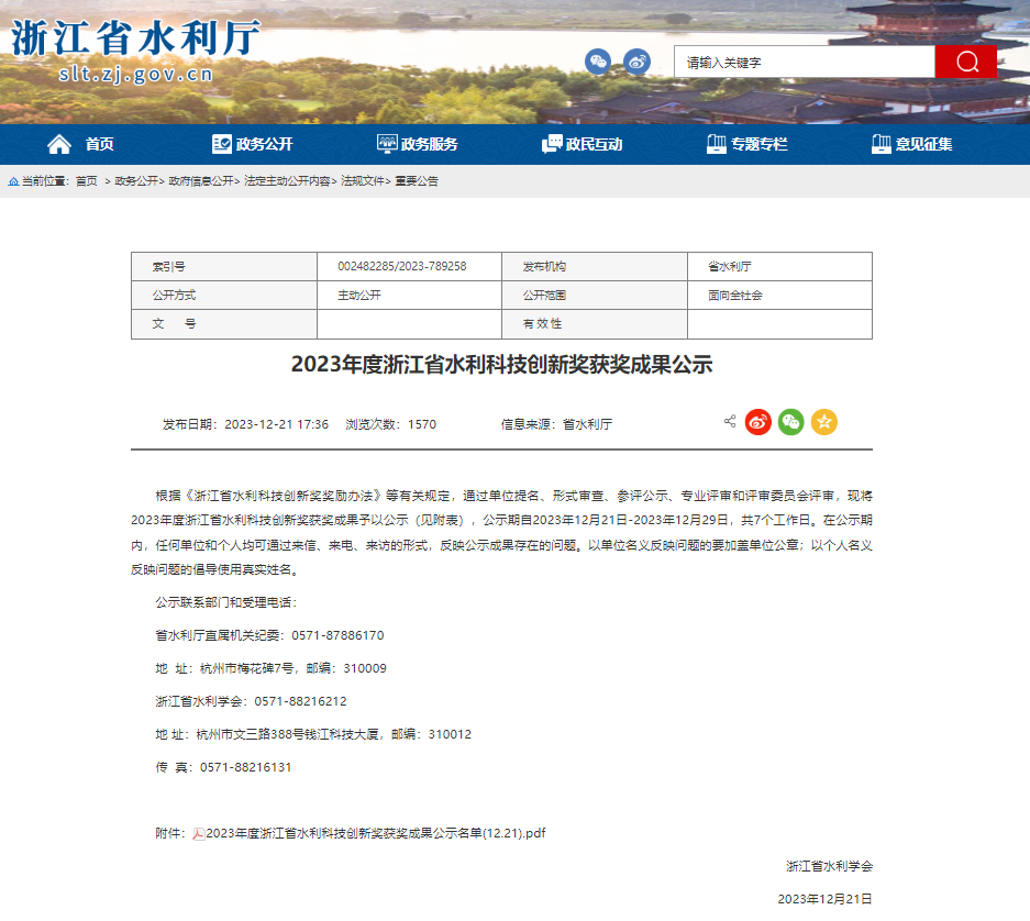 喜報 | 我院3項成果榮獲2023年度浙江省水利科技創新獎!