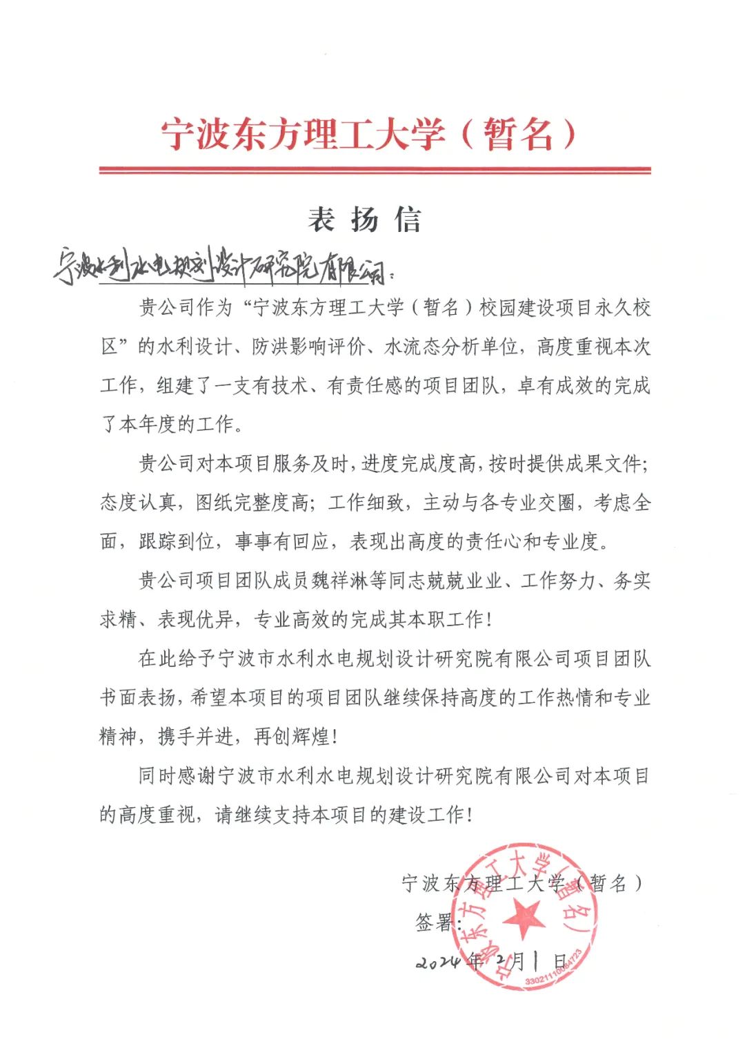 發布日期:2024.02.07 辭舊迎新之際,寧波市水利院收到寧波東方理工大學的感謝信。信中提到,我院在寧波東方理工大學(暫名)校園永久校區建設項目中,派出的項目團隊高效、專業、及時地做好技術支撐服務工... -