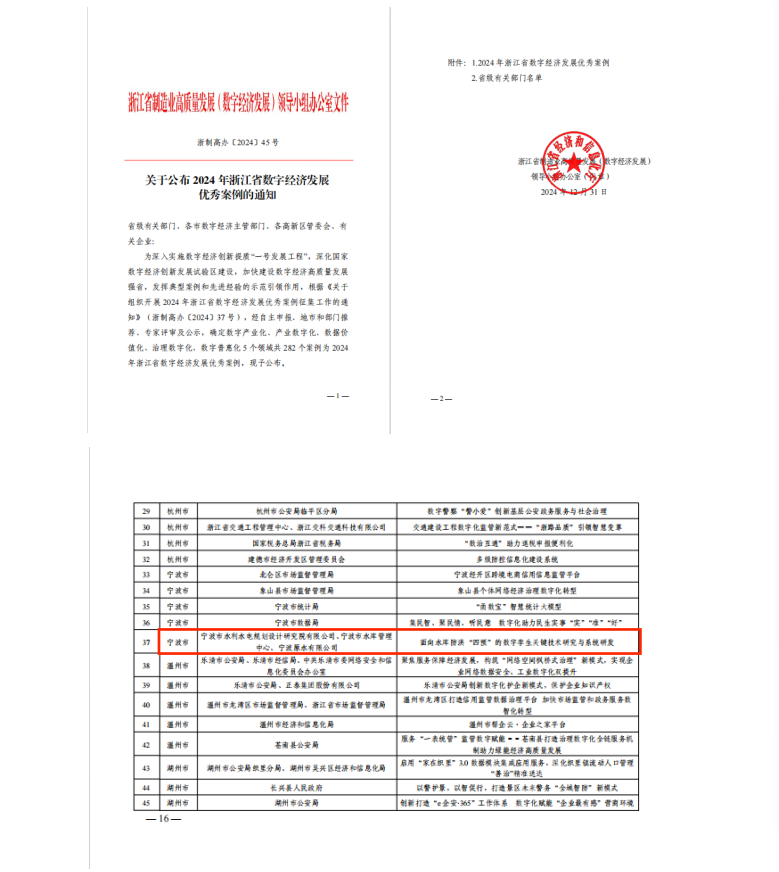 近日,浙江省經(jīng)濟和信息化廳發(fā)布《2024年浙江省數(shù)字經(jīng)濟優(yōu)秀案例擬確定名單》并完成公示,我院與寧波市水庫管理中心、寧波原水有限公司聯(lián)合申報的“面向水庫防洪‘四預(yù)’的數(shù)字孿生關(guān)鍵技術(shù)研究與系統(tǒng)研發(fā)”案例成功入選。