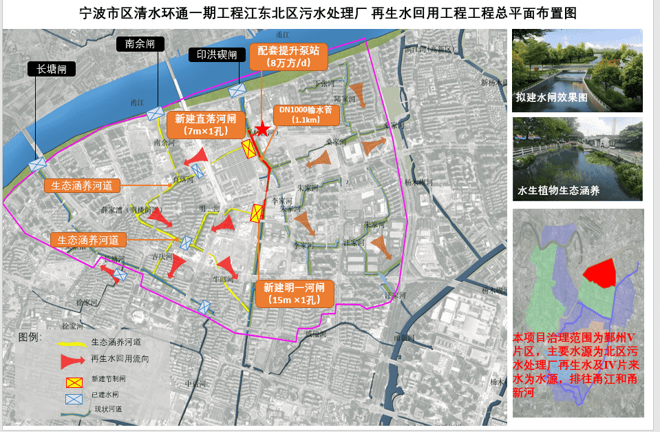 寧波市區清水環通一期工程江東北區污水處理廠再生水回用工程為增加河網水環境用水量,提升河網水體透明度及水體質量,配套新建廠內泵站1座,新建河道攔河鋼壩2座,新建再生水回用管道約1.1km,管道直徑約DN1000。水泵加壓后,通過引水管道將廠內的水引至廠區外,與廠外的的輸水管道相接,管道沿后西河布置,并在直落河與明一河中設置兩個排口,出口各設置一座閥門井及一座攔河鋼壩。同時在直落河排口下游、明一河排口下游新建生態水源涵養區4.9km,配套岸線修復若干。