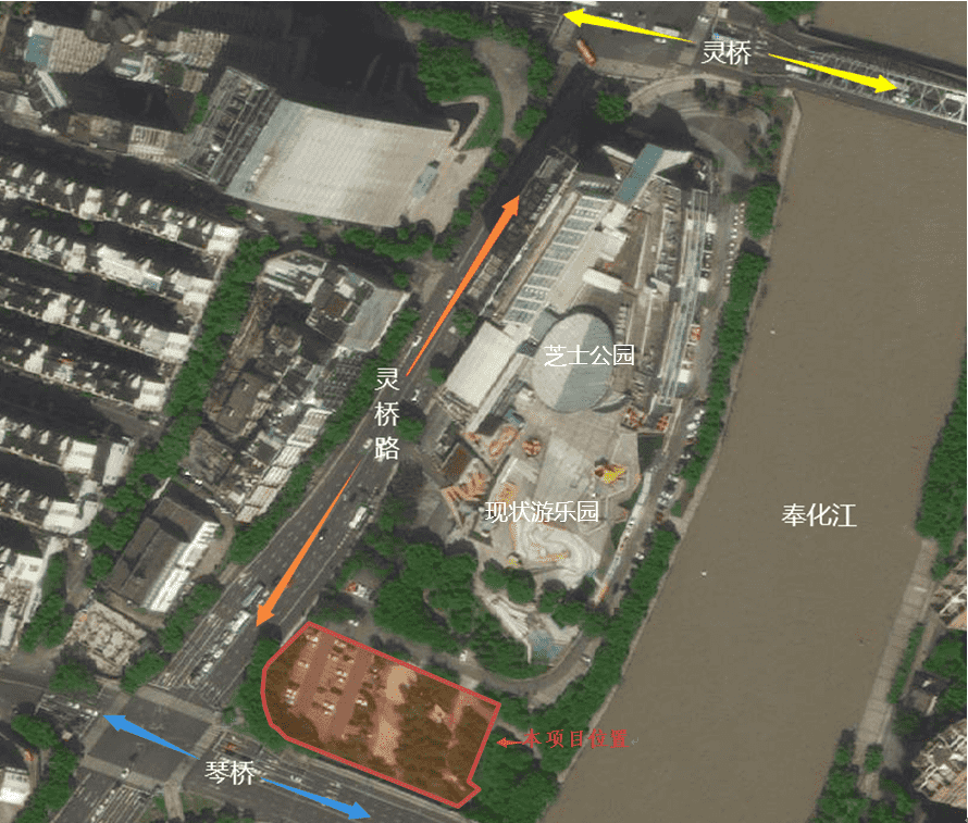 項目地塊位于芝士公園南側(cè),東臨奉化江,南鄰琴橋,西臨靈橋路,北至現(xiàn)狀游樂場。芝士公園位于寧波市海曙區(qū)靈橋路768號,處于寧波核心地段三江口,臨近奉化江,對內(nèi)對外交通十分便利,區(qū)域優(yōu)勢明顯。