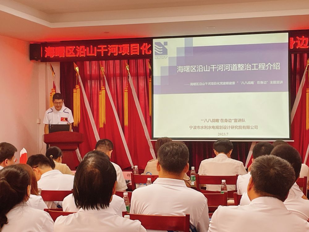 近日,海曙區直機關工委和區水利局以“五最黨建”為引領,在集士港鎮岳童村文化禮堂舉行沿山干河項目化黨建聯建暨“‘八八戰略’在身邊”主題宣講啟動儀式,我院作為沿山干河項目參建單位、活動的承辦方參與了啟動儀式。我院黨總支書記、副院長王洪霞,工程設計項目組及青年黨員代表十余人參加了上述活動。