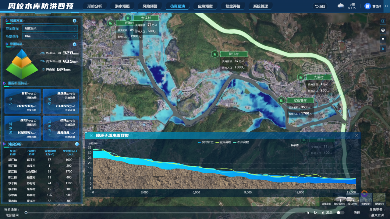 入庫1800多場歷史臺風(fēng)信息,通過臺風(fēng)路徑相似度匹配,獲取歷史臺風(fēng)周公宅水庫、皎口水庫庫區(qū)降雨網(wǎng)格化數(shù)據(jù),為預(yù)報和調(diào)度決策提供參考。建設(shè)鄞江流域產(chǎn)匯流模型、梯級水庫聯(lián)合調(diào)度模型和水庫下游一二維耦合水動力模型,通過水庫調(diào)度對下游防洪影響的正向預(yù)演,以及對上游庫區(qū)淹沒和大壩自身安全的逆向推演,動態(tài)推薦多目標(biāo)優(yōu)化調(diào)度方案,有力支撐水庫從前期預(yù)泄、中期錯峰到后期攔蓄的全過程調(diào)度決策。將傳統(tǒng)的各水庫獨(dú)立預(yù)報的流程進(jìn)行重塑,實(shí)現(xiàn)兩座水庫工作人員在同一平臺上協(xié)同操作、實(shí)時計算與快速分析,聯(lián)合預(yù)報調(diào)度方案的制定時間從原先的10分鐘縮減至目前的1—2分鐘,顯著提升了洪水預(yù)報效率。同時,周公宅水庫、皎口水庫高精度的洪水預(yù)報,為寧波市甬江流域一體化調(diào)度提供較為精確的上邊界條件,提高了下游平原河網(wǎng)的洪水預(yù)報精度,在近年的流域防洪中發(fā)揮了很好的實(shí)戰(zhàn)作用。