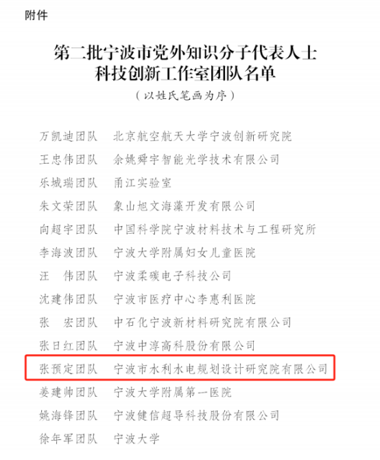 張預定創新工作室榮獲“寧波市黨外知識分子科技創新工作室”授牌,是對我院在水利領域深耕創績的肯定和認可,也對我院將來的工作推進提出了更高的標準和要求。為此,我院將以此為契機,積極發揮榜樣團隊的示范引領作用,進一步激勵和支持廣大員工立足崗位、投身科技創新,以實干思維緊扣謀事成事的主旋律,以鉆研精神夯實攻堅克難的基本功,力求在新質生產力培育發展上再創佳績,為寧波水利高質量發展作出新貢獻。